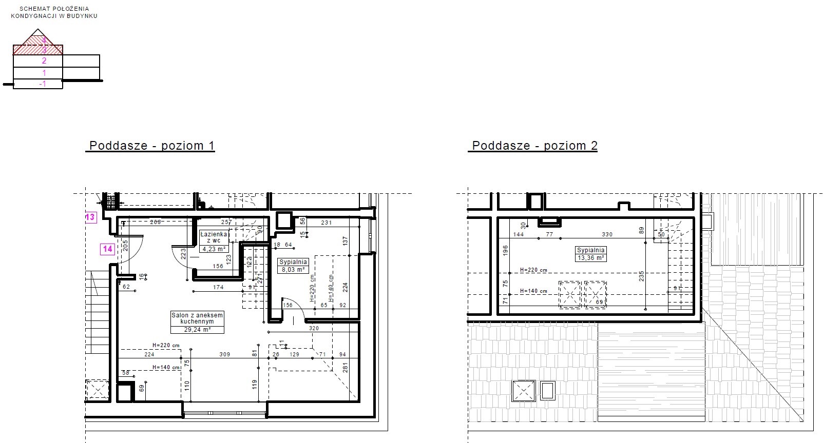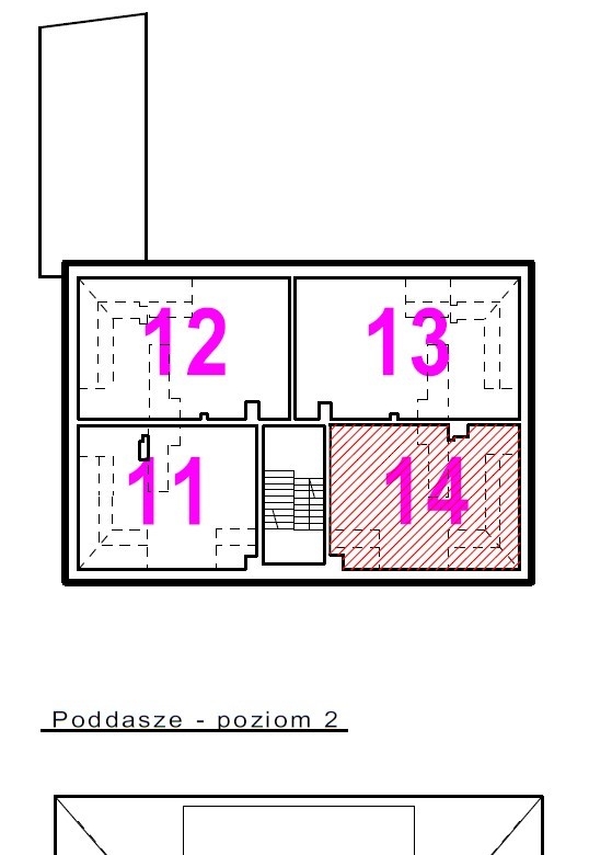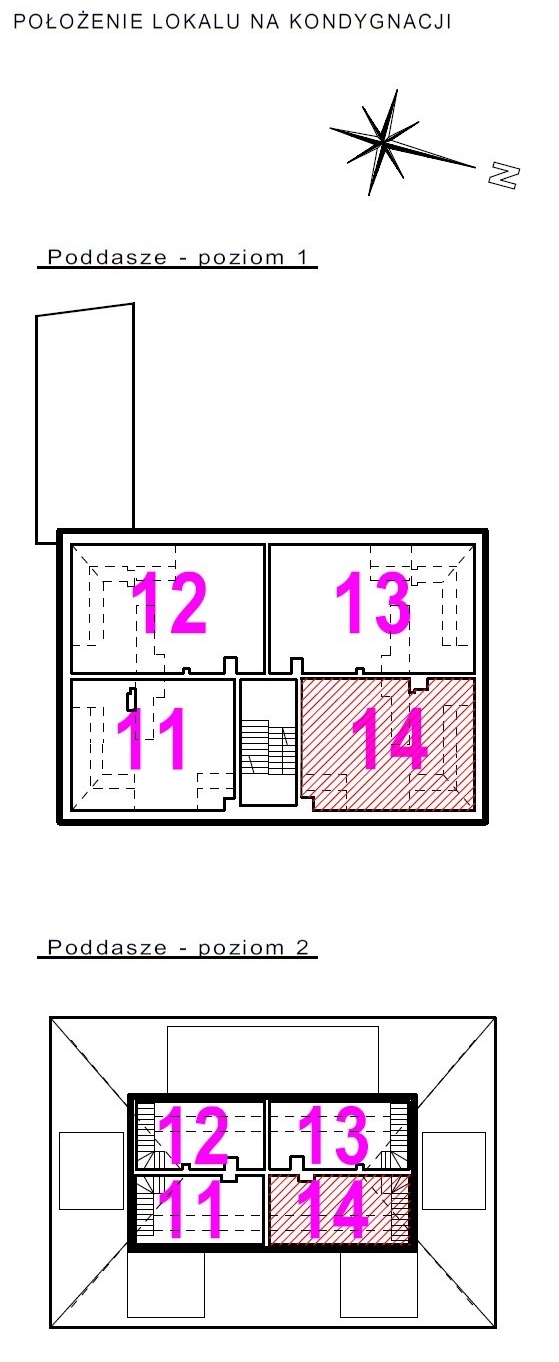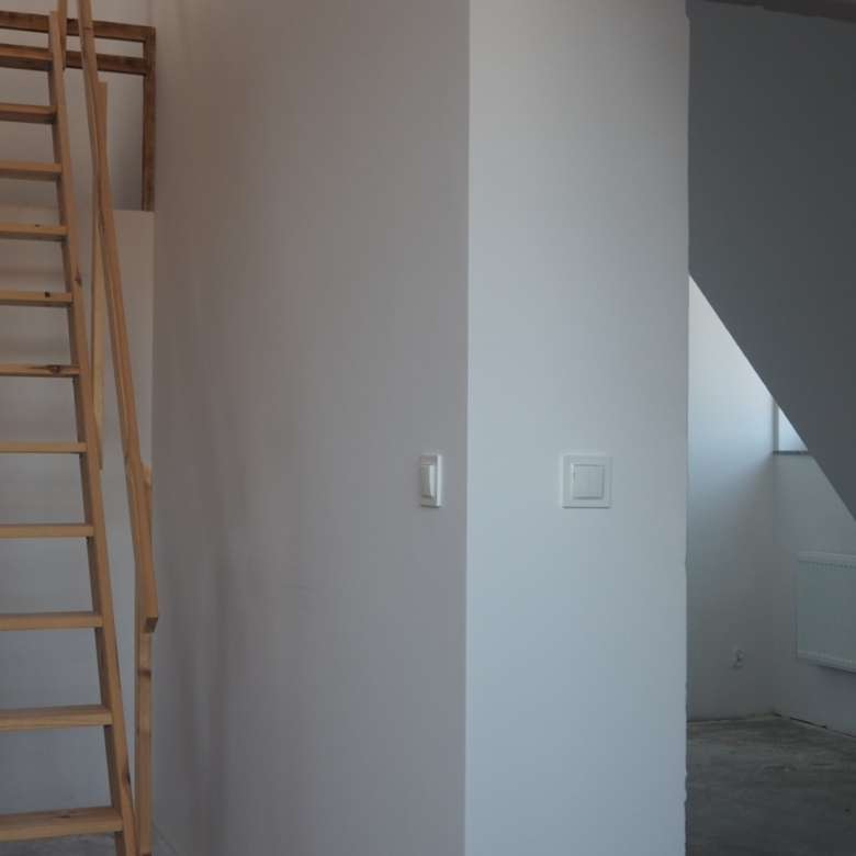 Dwupoziomowe mieszkanie nr 14 posiada ekspozycję na dwie strony świata. Poziom pierwszy to bardzo przestronny salon, sypialnia małżeńska oraz łazienka. Poziom drugi natomiast został wykończony jako przestrzeń otwarta, która nadaje się do dowolnej aranżacji przez nowego Właściciela. Przestrzeń reprezentacyjna, do której prowadzą drewniane i eleganckie drzwi antywłamaniowe, została wysunięta na pierwszy plan. Salon o wysokości ponad trzech metrów wypełniony jest dziennym światłem z trzech dużych okien. Po prawej stronie drzwi znajduje się miejsce dla dużej szafy na okrycia wierzchnie. W części przygotowanej pod aneks kuchenny, zapewniono podejścia pod zlewozmywak i zmywarkę, płytę kuchenną i piekarnik oraz lodówkę. Za prawidłowy klimat wnętrza odpowiada wentylacja mechaniczna. Dodatkowo zapewniono osobny kanał do montażu okapu kuchennego. Atutem lokalu jest przestronna łazienka przygotowana pod aranżację z obszerną kabiną prysznicową, w której też zainstalowano duży grzejnik z miejscem na ręczniki kąpielowe.