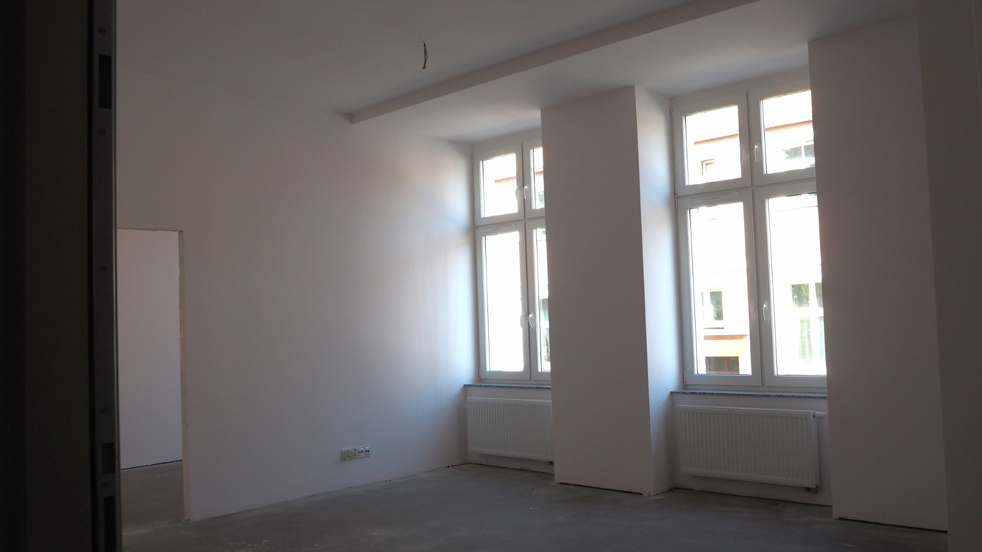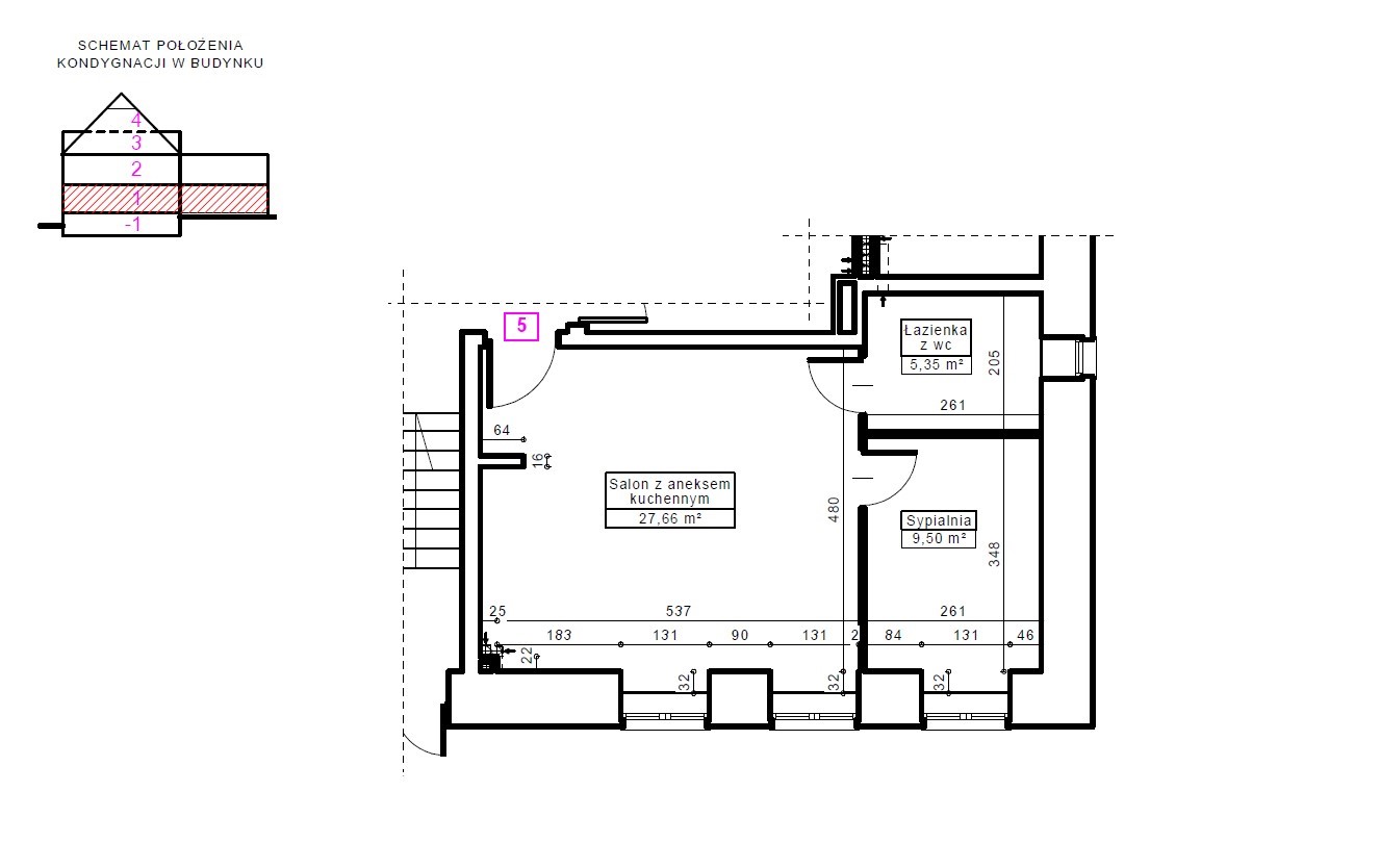 Mieszkanie nr 5 ma charakter ponad czterdziestometrowego apartamentu, składającego się z sypialni małżeńskiej, łazienki z oknem oraz przestronnego salonu z aneksem kuchennym. Przestrzeń reprezentacyjna, do której prowadzą drewniane i eleganckie drzwi antywłamaniowe, została wysunięta na pierwszy plan. Salon o wysokości około trzech metrów wypełniony jest dziennym światłem z dwóch dużych okien. Po prawej stronie drzwi znajduje się wnęka stworzona z myślą o szafie na okrycia wierzchnie, dalej część przygotowana pod aneks kuchenny, w której zapewniono podejścia pod zlewozmywak i zmywarkę, płytę kuchenną i piekarnik oraz lodówkę. Za prawidłowy klimat wnętrza odpowiada wentylacja mechaniczna. Dodatkowo zapewniono osobny kanał do montażu okapu kuchennego. Atutem lokalu jest przestronna łazienka przygotowana pod aranżację z obszerną kabiną prysznicową, w której też zainstalowano duży grzejnik z miejscem na ręczniki kąpielowe.
